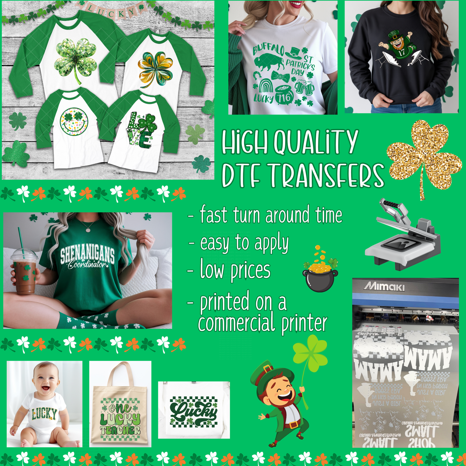 Pre-Made St Patrick's Day Lucky DTF Gang Sheet 22x36 with with 8 adult size and 1 Sleeve Design